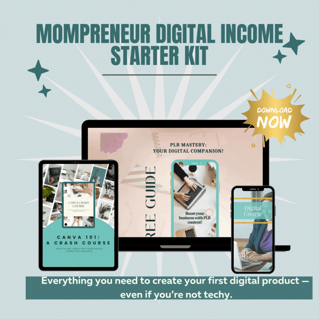 Grab my FREE Mompreneur Digital Income Starter Kit — Canva Crash Course, Ebook Template, 50+ Product Ideas, and a PLR Guide with Resell Rights.